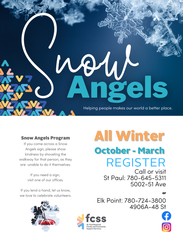 Snow Angels are invited to call FCSS and have their name added to the Snow Angels List. We will call you if there is someone in need.